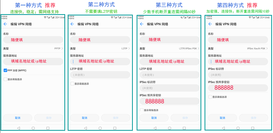 如PPTP方式連接不了,請嘗試用L2TP預共享密鑰方式,密鑰都是888888