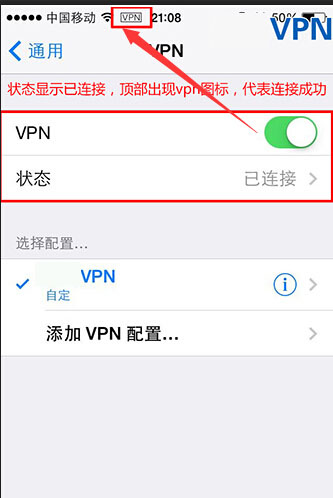第八步: 連接成功,狀態顯示已連接,頂部出現圖標,表示連接成功