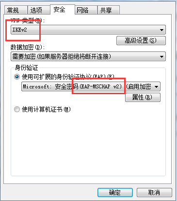 (四)然后在安全選項卡里面選擇IKEv2,身份驗證里選擇“EAP-MSCHAP v2”確定后即可點擊連接了