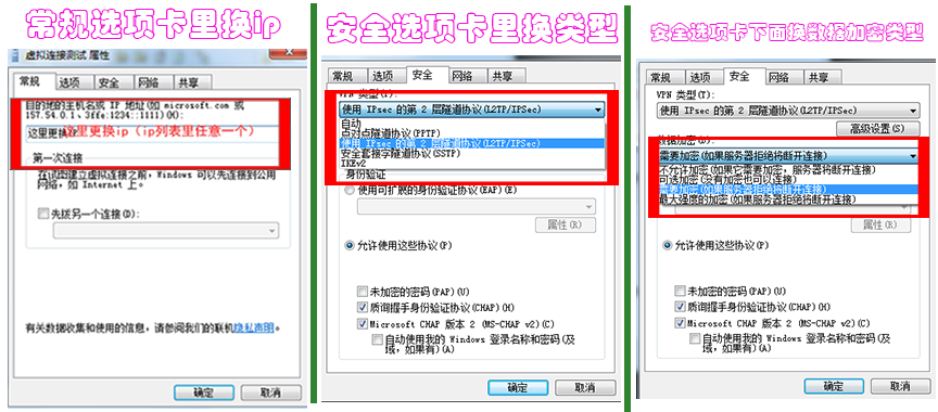 可以在“安全”選項卡里面更換類型(服務器都支持PPTP/L2TP/IPSec/IKEv2);