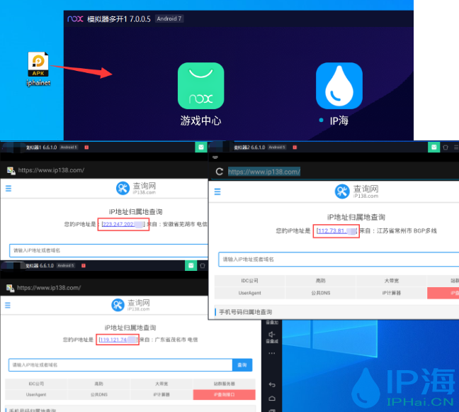 將模擬器所需的APK文件放到桌面,然后直接用鼠標把這個安卓安裝包拖入模擬器里的在模擬器里安裝就可以了,然后通過每個窗口的瀏覽器來驗證一下IP的變化,可以看到IP都改變了,說明是生效了,這也進一步說明了游戲玩家和游戲工作室的確是非常需要IP代理換IP軟件這一技術幫助他們取得更好的游戲體驗。